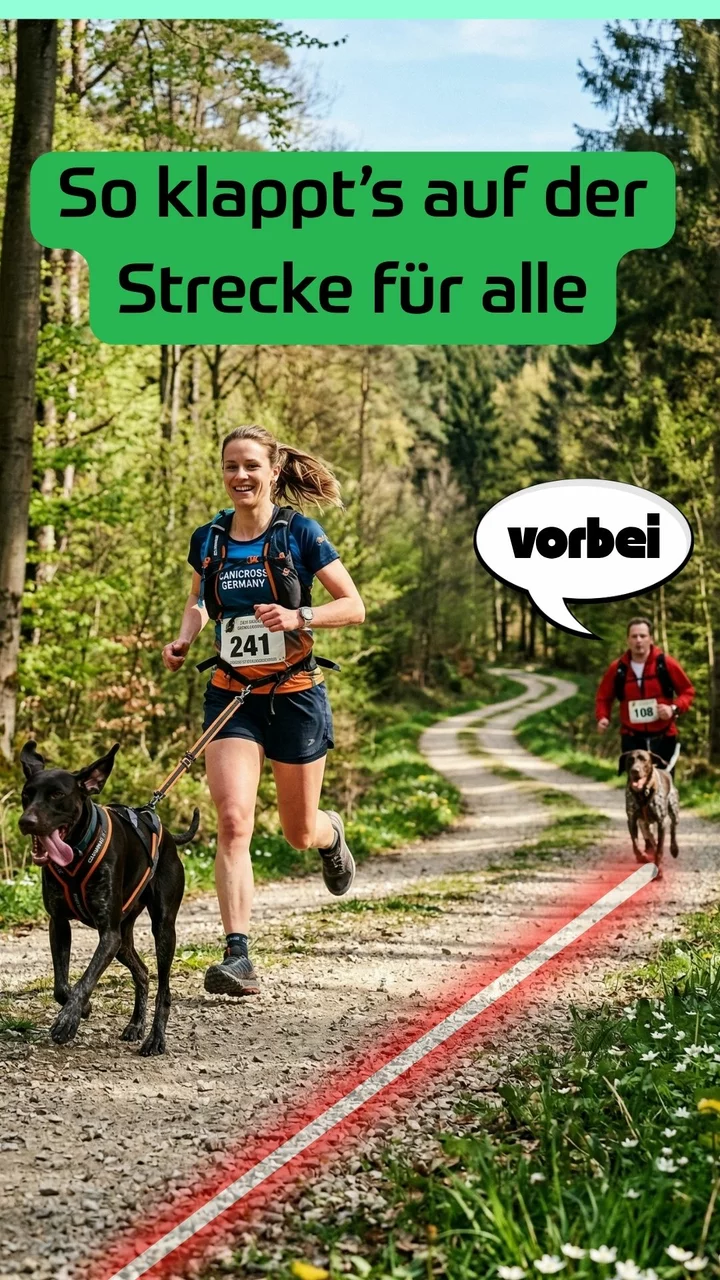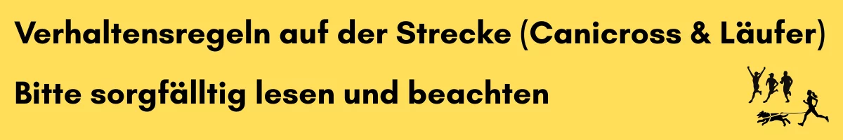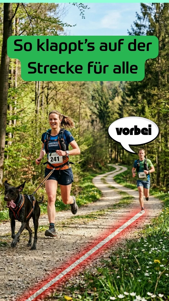 Gilt für alle Teilnehmer. Bei Begegnung Canicross ↔ Läufer/Walker: Überholen kurz mit „Trail“ oder „Vorbei“ ankündigen und auf Rufe achten.