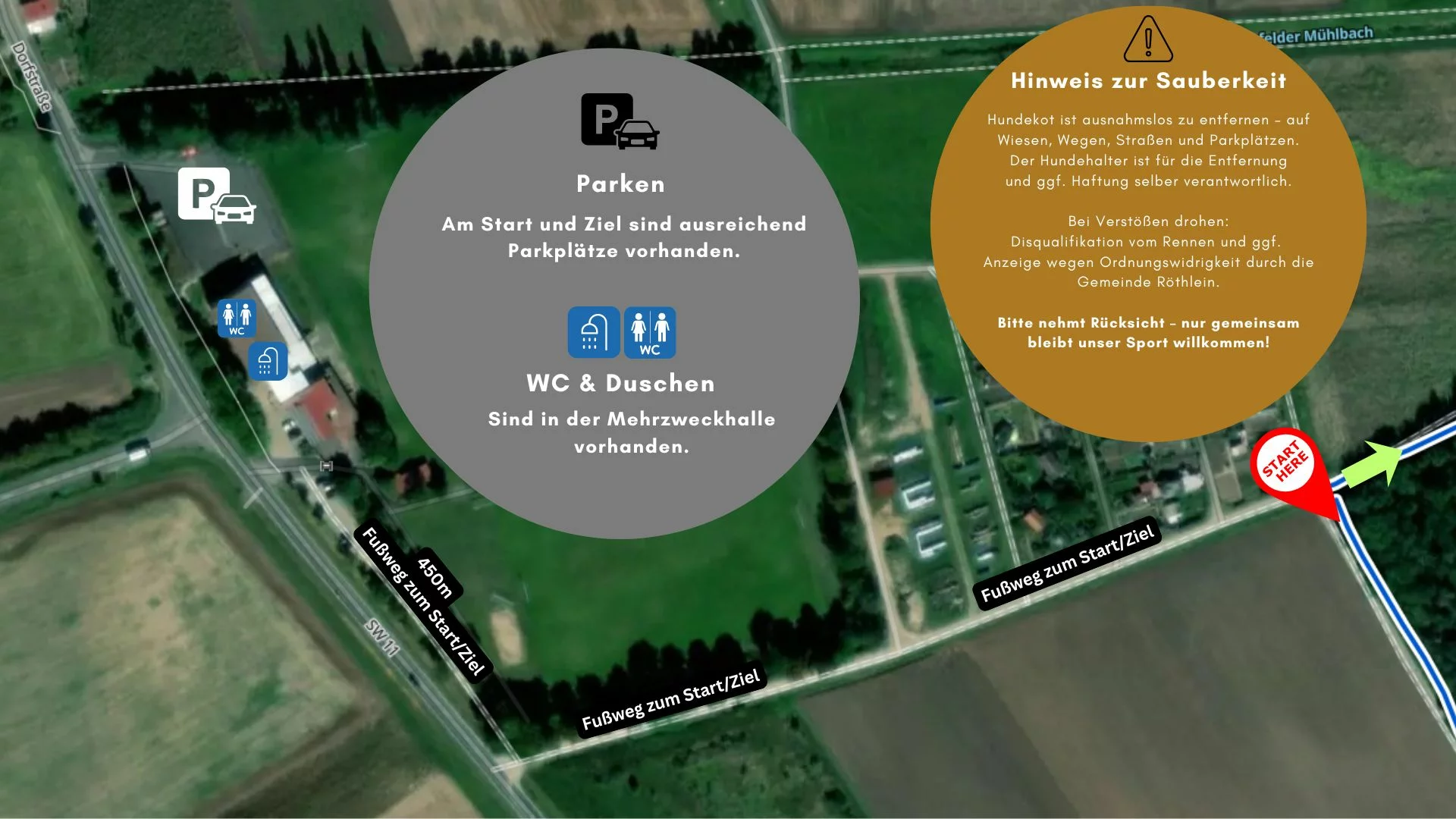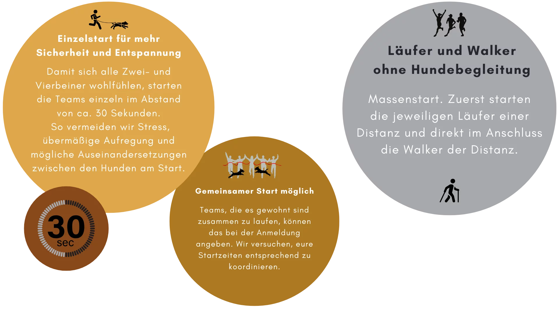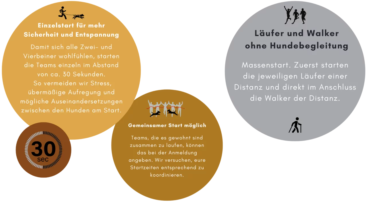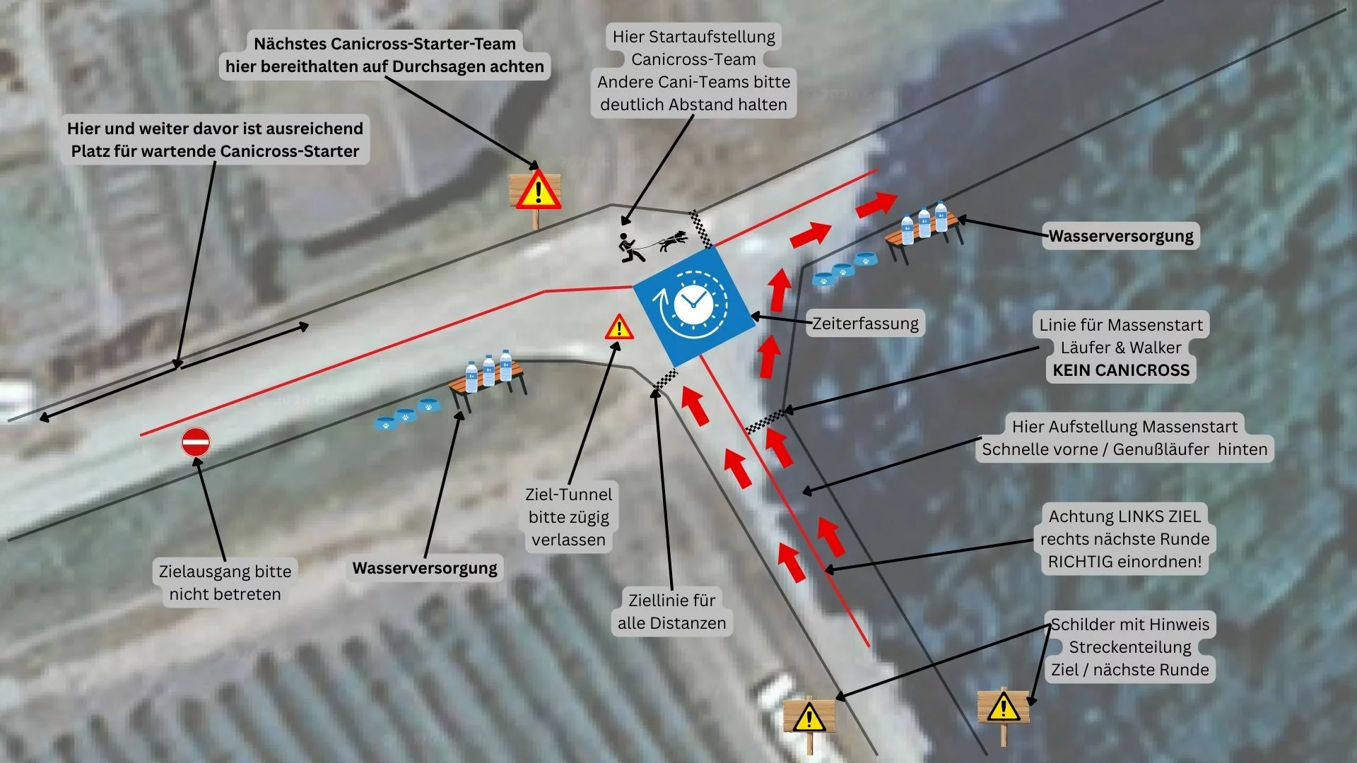 Im Start/Ziel bzw. bei jeder Runde steht Wasser für Läufer und Hund bereit. Der Läufer muss sich eigenverantwortlich um die richtige Anzahl der Runden kümmern!